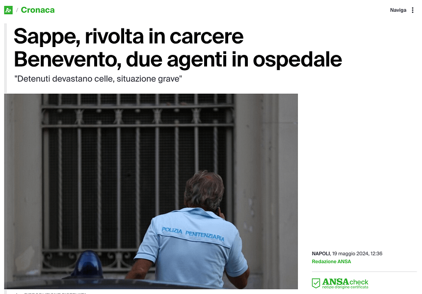 Rivolta al carcere di Benevento le TV dove sono? quando ci sono abusi ( capita raramente ) da parte del personale di Polizia Penitenziaria ci sbomballate con trasmissioni continue mentre quando finiscono in ospedale gli Agenti è tutto normale